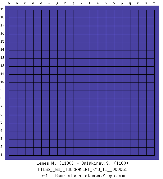 Last move : 0-1 2018 February 23 3:4:29 [Event "FICGS__GO__TOURNAMENT_KYU_II__000065"] [Site "FICGS"] [Date "2018.01.23"] [Round "1"] [Black "Lemes,Matheus"] [White "Balakirev,Stanislav"] [Result "0-1"] [Rating 1 "1100"] [Rating 2 "1100"] 0-1 This go game has been lost on time (started : 2018.01.23 15:14:6) Here are the names of the openings (joseki) played in the four corners : Player White won this Go (weiqi, baduk) game. Follow this game move after move (download)Nothing requires doing this or that, but necessity exists. (Pierre Audouard) Political correctness is subjecting us to gross incompetence. (Johann Piek)