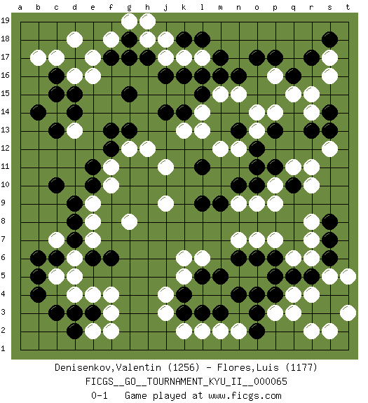 Last move : 0-1 2018 February 1 9:46:20 [Event "FICGS__GO__TOURNAMENT_KYU_II__000065"] [Site "FICGS"] [Date "2017.12.22"] [Round "1"] [Black "Denisenkov,Valentin"] [White "Flores,Luis"] [Result "0-1"] [Rating 1 "1256"] [Rating 2 "1177"] 1.q16 q4 2.c16 d4 3.c6 f3 4.b4 e16 5.d14 c14 6.d15 d13 7.c10 c17 8.d17 d16 9.c15 e17 10.c13 b17 11.b14 r14 12.o17 s16 13.r17 r11 14.l3 j3 15.o3 p3 16.o4 q6 17.c3 k5 18.l5 l6 19.m5 k6 20.k16 n7 21.p4 q3 22.g17 m2 23.m3 n2 24.o2 l2 25.o6 o7 26.p6 p7 27.k3 k2 28.k4 j4 29.n6 p14 30.g15 n15 31.m16 m15 32.l15 l14 33.k14 l13 34.l9 k13 35.j14 j9 36.l11 j11 37.o10 n9 38.n10 n12 39.m9 o9 40.q10 p10 41.p11 p9 42.o11 q11 43.n13 m12 44.o12 o13 45.p13 o14 46.n16 d6 47.d7 c5 48.b5 c7 49.b6 e7 50.d8 e8 51.d9 e9 52.e10 f10 53.e11 f11 54.f12 g12 55.f13 f18 56.e6 d5 57.f6 g8 58.e3 e4 59.d3 f4 60.g13 h12 61.r3 r4 62.s3 r2 63.s14 r15 64.r13 s12 65.s13 s17 66.s18 h18 67.g18 g19 68.f17 d18 69.h17 j18 70.k18 j17 71.j16 k17 72.l18 l17 73.m17 p16 74.p17 q15 75.l16 h19 76.s6 r10 77.s4 s2 78.s8 r7 79.s7 t3 80.n4 e2 81.d2 f2 82.t4 s5 83.r5 t5 84.q5 r6 85.p5 r8 0-1 Here are the names of the openings (joseki) played in the four corners : Corner d4 : d4 c6 Hoshi (Hwajeom, Seongjeom, Xingwei`) 4-4 Point. The star or hoshi (4-4) point, emphasizing influence at the potential expense of territory. Ikken Kakari (Hankan Keolch'im, Yi Gua`jiao~, 1-Space Low Approach). Black 2 is the standard approach move to the 4-4. Corner d16 : c16 e16 Komoku (Somok, Xiao~mu`) 3-4 Point. The komoku (3-4) point is the traditional corner enclosure move.. Ikken Takagakari (Hankan Nop'dakeolch'im, Yi Gaogua`jiao~, 1-Space High Approach). The 5-4 approach move has become more popular in modern times, as modern Go emphasizes speed and influence. Corner q16 : q16 r14 Hoshi (Hwajeom, Seongjeom, Xingwei`) 4-4 Point. The star or hoshi (4-4) point, emphasizing influence at the potential expense of territory. Ikken Kakari (Hankan Keolch'im, Yi Gua`jiao~, 1-Space Low Approach). White 2 is the standard approach move to the 4-4. Corner q4 : q4 l3 Hoshi (Hwajeom, Seongjeom, Xingwei`) 4-4 Point. The star or hoshi (4-4) point, emphasizing influence at the potential expense of territory. Player White won this Go (weiqi, baduk) game. Follow this game move after move (download)Do not fear furikawari. (Anonymous) Horse racing is animated roulette. (Roger Kahn)