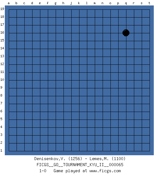 Last move : 1-0 2018 February 23 3:4:29 [Event "FICGS__GO__TOURNAMENT_KYU_II__000065"] [Site "FICGS"] [Date "2018.01.23"] [Round "1"] [Black "Denisenkov,Valentin"] [White "Lemes,Matheus"] [Result "1-0"] [Rating 1 "1256"] [Rating 2 "1100"] 1.q16 1-0 This go game has been lost on time (started : 2018.01.23 15:14:6) Here are the names of the openings (joseki) played in the four corners : Player Black won this Go (weiqi, baduk) game. Follow this game move after move (download)Beginner's games are surprising, often incoherent and incomprehensible. When you improve, your game gains in consistency but flirts with stupidity: you become satisfied with truisms and mechanical movements, you try to obtain a feeling for clearness and style the easy way. (Pierre Audouard) The arrogant army will lose certainly the battle. (Chinese proverb)