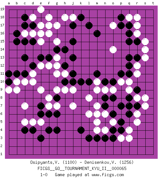Last move : 1-0 2018 January 16 11:35:25 [Event "FICGS__GO__TOURNAMENT_KYU_II__000065"] [Site "FICGS"] [Date "2017.12.22"] [Round "1"] [Black "Osipyants,Vladimir"] [White "Denisenkov,Valentin"] [Result "1-0"] [Rating 1 "1100"] [Rating 2 "1256"] 1.q16 d16 2.c4 q4 3.e3 o17 4.m16 r17 5.q17 r16 6.q15 q18 7.p18 r18 8.p17 s14 9.q13 d10 10.k4 q10 11.j17 g17 12.j15 g15 13.c17 c16 14.d17 e17 15.e18 f18 16.e16 f17 17.b16 e15 18.b15 d18 19.c18 e19 20.c13 c7 21.o3 r6 22.g4 p3 23.o4 r12 24.q8 r8 25.r9 q9 26.r7 s8 27.q7 s7 28.q6 r5 29.p5 e5 30.g6 c5 31.d4 d5 32.j13 f12 33.c11 c10 34.b11 b10 35.a10 a9 36.a11 b9 37.g8 l8 38.o8 l6 39.o10 m4 40.l3 n6 41.n5 m5 42.n7 m7 43.n8 j7 44.l10 j9 45.j11 g9 46.e7 e9 47.p11 j18 48.k18 h18 49.l17 m10 50.m11 m9 51.k10 o9 52.n10 n9 53.o6 m6 54.p7 p10 55.q11 r11 56.q12 f7 57.f6 f8 58.e6 g7 59.m3 n4 60.n3 o5 61.p4 q3 62.f4 o14 63.r13 s13 64.r15 s15 65.d15 f16 66.c15 e16 67.e13 d11 68.d12 e12 69.f13 h11 70.h12 g12 71.h10 g11 72.j10 h9 73.h14 g13 74.g14 1-0 Here are the names of the openings (joseki) played in the four corners : Corner q16 : q16 o17 Hoshi (Hwajeom, Seongjeom, Xingwei`) 4-4 Point. The star or hoshi (4-4) point, emphasizing influence at the potential expense of territory. Ikken Kakari (Hankan Keolch'im, Yi Gua`jiao~, 1-Space Low Approach). White 2 is the standard approach move to the 4-4. Corner d16 : d16 j17 Hoshi (Hwajeom, Seongjeom, Xingwei`) 4-4 Point. The star or hoshi (4-4) point, emphasizing influence at the potential expense of territory. Corner q4 : q4 o3 Hoshi (Hwajeom, Seongjeom, Xingwei`) 4-4 Point. The star or hoshi (4-4) point, emphasizing influence at the potential expense of territory. Ikken Kakari (Hankan Keolch'im, Yi Gua`jiao~, 1-Space Low Approach). Black 2 is the standard approach move to the 4-4. Player Black won this Go (weiqi, baduk) game. Follow this game move after move (download)Go is to western chess what philosophy is to double entry accounting. (from Shibumi, by Trevanian) There will be no order, only chaos. (Sol Robeson in Pi by Darren Aronofsky)