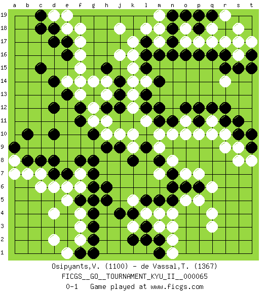 Last move : 0-1 2018 February 5 22:6:23 [Event "FICGS__GO__TOURNAMENT_KYU_II__000065"] [Site "FICGS"] [Date "2017.12.22"] [Round "1"] [Black "Osipyants,Vladimir"] [White "de Vassal,Thibault"] [Result "0-1"] [Rating 1 "1100"] [Rating 2 "1367"] 1.q16 d4 2.d17 q4 3.c15 r14 4.q12 r17 5.r16 q17 6.p16 p17 7.n16 o17 8.o16 m17 9.l15 j16 10.d10 q10 11.r11 r10 12.k4 n4 13.g3 c6 14.c8 f3 15.g4 o10 16.n7 p7 17.o6 p5 18.p6 q6 19.m5 f4 20.o12 m10 21.k8 f6 22.e13 f17 23.n17 m18 24.n18 o18 25.n19 m19 26.m16 k17 27.h6 g5 28.h5 b7 29.b8 s16 30.s15 s17 31.r15 k10 32.l12 l11 33.m12 m4 34.l5 k12 35.l3 m3 36.g2 f2 37.f1 e1 38.g1 d2 39.s10 s9 40.s11 r9 41.t9 t8 42.t10 s8 43.f8 o7 44.n5 o5 45.n6 n8 46.m8 m9 47.l9 a8 48.a9 a7 49.b10 e18 50.d18 f15 51.g13 h11 52.f11 q3 53.g6 f7 54.g8 e14 55.d14 f13 56.f12 f14 57.d12 c7 58.d8 g12 59.j14 h14 60.j13 h13 61.j12 k13 62.l13 k14 63.h12 g11 64.h15 g14 65.f5 e5 66.e7 e6 67.d7 q11 68.r12 k15 69.l17 l18 70.l16 j18 71.m2 n2 72.l2 n1 73.m1 n3 74.e17 f18 75.e16 f16 76.g10 h10 77.h9 k9 78.j9 j10 79.p11 p10 80.o19 p19 81.t16 t17 82.q19 r19 83.p18 q18 84.p19 s18 85.t15 o11 86.p12 d19 87.c19 e19 88.c18 d6 89.n11 n10 90.m11 k16 91.g7 l4 92.g5 l14 93.m14 k3 94.k2 k5 95.j4 m7 0-1 Here are the names of the openings (joseki) played in the four corners : Corner q16 : q16 r14 Hoshi (Hwajeom, Seongjeom, Xingwei`) 4-4 Point. The star or hoshi (4-4) point, emphasizing influence at the potential expense of territory. Ikken Kakari (Hankan Keolch'im, Yi Gua`jiao~, 1-Space Low Approach). White 2 is the standard approach move to the 4-4. Corner d4 : d4 g3 Hoshi (Hwajeom, Seongjeom, Xingwei`) 4-4 Point. The star or hoshi (4-4) point, emphasizing influence at the potential expense of territory. Niken Kakari (Dukan Keolch'im, E`r Gua`jiao~, 2-Space Low Approach). White typically answers by 7-3 or 3-5 (which is not joseki). Player White won this Go (weiqi, baduk) game. Follow this game move after move (download)Atari, atari is vulgar play. (Anonymous) It's only after you lost everything, Tyler says, that you're free to do anything. (Chuck Palahniuk, Fight Club)