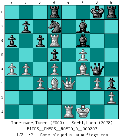Last move : 1/2-1/2 2018 April 9 22:53:36 [Event "FICGS__CHESS__RAPID_A__000207"] [Site "FICGS"] [Date "2017.12.23"] [Round "1"] [White "Tanriover,Taner"] [Black "Sorbi,Luca"] [Result "1/2-1/2"] [WhiteElo "2000"] [BlackElo "2028"] 1.e4 e5 2.Nf3 Nf6 3.Nxe5 d6 4.Nxf7 Kxf7 5.Nc3 Be6 6.d4 Be7 7.f4 g6 8.Bd3 Kg7 9.O-O c6 10.f5 gxf5 11.exf5 Bf7 12.Ne4 h6 13.Qf3 Nxe4 14.Qxe4 Bf6 15.c3 Nd7 16.Qg4+ Kh7 17.Bf4 Qg8 18.Qh3 h5 19.Be2 h4 20.Rae1 Qf8 21.Bd3 Kg8 22.Re6 d5 23.Rfe1 Qg7 24.Rd6 Rd8 25.Qe3 h3 26.g3 a6 27.b4 Bh5 28.a4 Bf7 29.Kf1 Qg4 1/2-1/2 Petrov : Cochrane gambit Kingside Castling by player White (move 9) This chess game ended in a draw. Follow this game move after move (download)I feel as if I were a piece in a game of Chess, when my opponent says of it: That piece cannot be moved. (Soren Kierkegaard) Viele Opfer benötigen überhaupt keine konkrete Berechnung. Es genügt sich die entstehende Position kurz vorzustellen, um uns davon zu überzeugen, dass das Opfer korrekt ist. (Mikhail Nekhemyevich Tal) De eso se trata el Ajedrez. Un día le das una lección a tu oponente y al día siguiente el te da una a tí. (Bobby Fischer) Toute estimation doit être constamment réévaluée. (Jacob Estrin) If things go wrong, don't go with them. (Roger Babson)