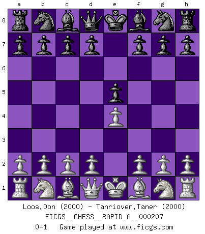 Last move : 0-1 2018 January 23 11:52:45 [Event "FICGS__CHESS__RAPID_A__000207"] [Site "FICGS"] [Date "2017.12.23"] [Round "1"] [White "Loos,Don"] [Black "Tanriover,Taner"] [Result "0-1"] [WhiteElo "2000"] [BlackElo "2000"] 1.e4 e5 0-1 This chess game has been lost on time (started : 2017.12.23 6:50:33) King's pawn game Player Black won this chess game. Follow this game move after move (download)It is no time to be playing Chess when the house is on fire. (Italian Proverb) Karpov ist ein Museumsstück. (Garry Kasparov) Tu cuerpo tiene que estar en óptima condición. Tu Ajedrez se deteriora como lo hace tu cuerpo. No puedes separar la mente y el cuerpo. (Bobby Fischer) Les Echecs ne sont pas pour les âmes timides. Ils requièrent un homme entier, qui ne s'arrête pas aveuglément à ce qui a été déjà établi, mais qui tente individuellement de sonder les profondeurs du jeu. (W. Steinitz) You can only get smarter by playing a smarter opponent. (Revolver, movie)