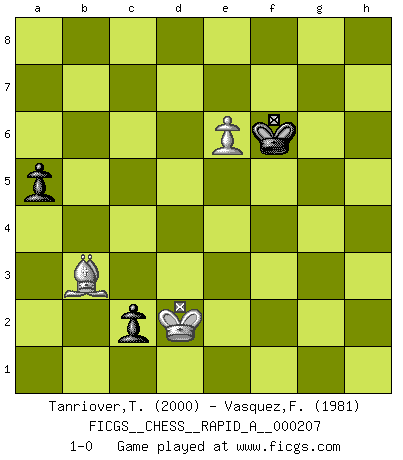 Last move : 1-0 2018 June 13 22:5:1 [Event "FICGS__CHESS__RAPID_A__000207"] [Site "FICGS"] [Date "2017.12.23"] [Round "1"] [White "Tanriover,Taner"] [Black "Vasquez,Fernando"] [Result "1-0"] [WhiteElo "2000"] [BlackElo "1981"] 1.h3 e5 2.a3 d5 3.e3 Nc6 4.d4 Nf6 5.Nf3 Be6 6.dxe5 Ne4 7.Bb5 g6 8.Qd4 Bg7 9.Nc3 Bd7 10.Qxd5 Nxc3 11.bxc3 O-O 12.O-O a6 13.Be2 Qe7 14.a4 Rfd8 15.Qc4 Qe8 16.Qh4 Nxe5 17.Nd4 c5 18.Nb3 c4 19.Nd4 Bxa4 20.Ba3 Rd7 21.Rab1 Qc8 22.Rfe1 Qc7 23.f4 Nc6 24.Bg4 f5 25.Bf3 Qa5 26.Ne6 Bxc2 27.Rxb7 Rxb7 28.Bxc6 Qxa3 29.Bxb7 Re8 30.Bd5 Kh8 31.Ng5 h6 32.Bf7 Re7 33.Bxg6 Kg8 34.Nf3 Qd6 35.Qh5 Bd1 36.Qxf5 Bxf3 37.gxf3 Bxc3 38.Re2 Qd1+ 39.Kf2 Qh1 40.Kg3 Qg1+ 41.Kh4 a5 42.Kh5 Kg7 43.e4 Qg3 44.Qg4 Qxg4+ 45.fxg4 Rd7 46.e5 Rd2 47.Re4 Rd4 48.Rxd4 Bxd4 49.Bc2 Be3 50.f5 Bc1 51.Be4 Bb2 52.e6 Bf6 53.Bc2 Bd8 54.h4 Be7 55.g5 hxg5 56.hxg5 Bd8 57.Ba4 Be7 58.Kg4 c3 59.Bb3 Bd8 60.Kf4 Be7 61.f6+ Bxf6 62.gxf6+ Kxf6 63.Ke3 c2 64.Kd2 1-0 Global Opening Kingside Castling by player Black (move 11) Kingside Castling by player White (move 12) 10 pieces endgame at move 55 : White KBPPP , Black KBPPP WHITE : King + 1 Bishop 3 Pawns BLACK : King + 1 Bishop 3 Pawns 9 pieces endgame at move 56 : White KBPPP , Black KBPP WHITE : King + 1 Bishop 3 Pawns BLACK : King + 1 Bishop 2 Pawns 8 pieces endgame at move 61 : White KBPP , Black KBPP WHITE : King + 1 Bishop 2 Pawns BLACK : King + 1 Bishop 2 Pawns 7 pieces endgame at move 62 : White KBPP , Black KPP WHITE : King + 1 Bishop 2 Pawns BLACK : King + 2 Pawns 6 pieces endgame at move 62 : White KBP , Black KPP WHITE : King + 1 Bishop 1 Pawn BLACK : King + 2 Pawns Player White won this chess game. Follow this game move after move (download)The battle for the ultimate truth will never be won. And that's why Chess is so fascinating. (Hans Kmoch) Rauchen ist dem Schachspieler bei seiner Arbeit, also im Wettkampf, untersagt. (Viktor Kortschnoi) Fischer es el jugador mas fuerte del mundo. De hecho, el jugador mas fuerte que jamas haya existido. (Larry Evans) Karpov est une pièce de musée. (Garry Kasparov) For a mechanic, you seem to do an excessive amount of thinking. (C-3PO in Star Wars ep.2)