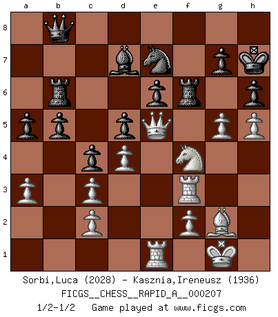 Last move : 1/2-1/2 2018 June 7 6:58:27 [Event "FICGS__CHESS__RAPID_A__000207"] [Site "FICGS"] [Date "2017.12.23"] [Round "1"] [White "Sorbi,Luca"] [Black "Kasznia,Ireneusz"] [Result "1/2-1/2"] [WhiteElo "2028"] [BlackElo "1936"] 1.e4 e6 2.d4 d5 3.Nc3 Nf6 4.Bg5 Bb4 5.e5 h6 6.Bd2 Bxc3 7.bxc3 Ne4 8.Qg4 Kf8 9.Bd3 Nxd2 10.Kxd2 c5 11.h4 c4 12.Be2 Bd7 13.Rh3 Nc6 14.Rg3 Rh7 15.Qf4 a5 16.Bh5 Qe7 17.Ke2 Be8 18.Rb1 b5 19.Kf1 Kg8 20.Ne2 Rb8 21.Kg1 Rb6 22.Qg4 Qd8 23.a3 Ne7 24.Qf4 Nf5 25.Rh3 Rh8 26.g3 Rb8 27.Bf3 Bc6 28.h5 Ne7 29.g4 Be8 30.Rg3 Kh7 31.Bg2 Rf8 32.Qe3 f6 33.Re1 Bd7 34.exf6 Rxf6 35.Rf3 Qf8 36.Nf4 Rb6 37.Nh3 Ng8 38.Ra1 Ra6 39.Nf4 Ne7 40.Qe5 Kg8 41.Kf1 Nc6 42.Qe3 Ne7 43.Re1 Rb6 44.Kg1 Kh7 45.Qe5 Qb8 46.g5 1/2-1/2 French : MacCutcheon, Lasker variation This chess game ended in a draw. Follow this game move after move (download)For surely of all the drugs in the world, Chess must be the most permanently pleasurable. (Assiac) Der Traum, für den ich lebe, ist der von einem freien Russland. Viele mögen sagen: Russland hat doch ein Parlament, einen gewählten Präsidenten. Aber ich spüre, dass in meiner Heimat die Angst wiederkehrt. Eine Angst, sich frei zu äußern, bestimmte Dinge zu tun (Garry Kasparov) En el Ajedrez, tal como en la vida, las bendiciones de hoy pueden ser el veneno del mañana. (Assaic) Mais n'est-ce pas déjà le limiter injurieusement que d'appeler les échecs un jeu? N'est-ce pas aussi une science, un art, ou quelque chose qui, comme le cercueil de Mahomet entre ciel et terre, est suspendu entre l'un et l'autre, et qui réunit un nombre incroyable de contraires ? (Stefan Zweig) Computers are like Old Testament gods; lots of rules and no mercy. (Joseph Campbell)