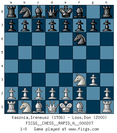 Last move : 1-0 2018 January 23 23:52:30 [Event "FICGS__CHESS__RAPID_A__000207"] [Site "FICGS"] [Date "2017.12.23"] [Round "1"] [White "Kasznia,Ireneusz"] [Black "Loos,Don"] [Result "1-0"] [WhiteElo "1936"] [BlackElo "2000"] 1.Nf3 Nf6 2.g3 1-0 This chess game has been lost on time (started : 2017.12.23 6:50:33) Reti Opening Player White won this chess game. Follow this game move after move (download)Chess demands total concentration. (Bobby Fischer) Ich kenne Menschen, die allen Willen der Welt besitzen und doch nicht Schach spielen können. (Robert James Fischer) El jugador de combinación piensa hacia adelante; comienza de la posición dada y trabaja las movidas contundentes en su mente. (Emanuel Lasker) Karpov est une pièce de musée. (Garry Kasparov) The human is the only animal species whose members are able to talk themselves into difficulties that would not otherwise exist. (Wendell Johnson)