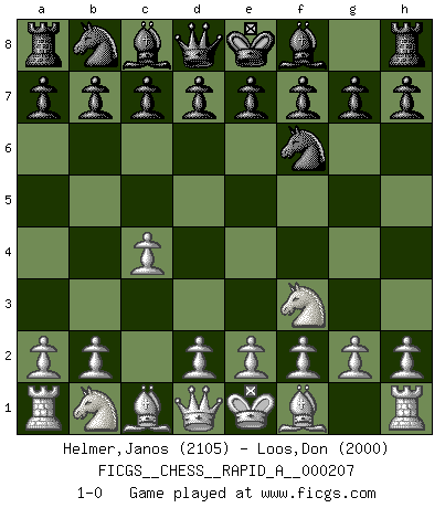 Last move : 1-0 2018 January 23 23:52:30 [Event "FICGS__CHESS__RAPID_A__000207"] [Site "FICGS"] [Date "2017.12.23"] [Round "1"] [White "Helmer,Janos"] [Black "Loos,Don"] [Result "1-0"] [WhiteElo "2105"] [BlackElo "2000"] 1.Nf3 Nf6 2.c4 1-0 This chess game has been lost on time (started : 2017.12.23 6:50:33) Reti Opening Player White won this chess game. Follow this game move after move (download)I don't believe in psychology. I believe in good moves. (Bobby Fischer) Immer nach dem besten Zug zu suchen ist ziemlich unpraktisch. (Nigel Short) ¿Que sería del Ajedrez sin errores graciosos?. (Kurt Richter) Seul un grand joueur sait à quel point il joue faiblement. (Xavier Tartacover) It is not titles that honor men, but men that honor titles. (Niccolo Machiavelli)
