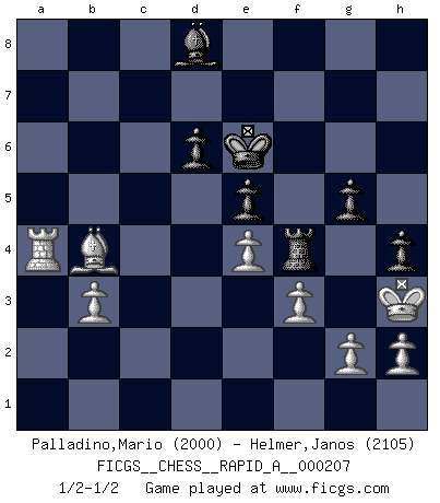 Last move : 1/2-1/2 2018 January 30 17:21:16 [Event "FICGS__CHESS__RAPID_A__000207"] [Site "FICGS"] [Date "2017.12.23"] [Round "1"] [White "Palladino,Mario"] [Black "Helmer,Janos"] [Result "1/2-1/2"] [WhiteElo "2000"] [BlackElo "2105"] 1.e4 c5 2.Nf3 d6 3.d4 cxd4 4.Nxd4 Nf6 5.Nc3 a6 6.Be3 e5 7.Nf3 Be7 8.Bc4 O-O 9.O-O Be6 10.Bxe6 fxe6 11.Na4 Nbd7 12.Ng5 Qa5 13.c4 Rfc8 14.Nxe6 Rxc4 15.Nc3 Nf8 16.Ng5 h6 17.Nf3 Kh8 18.Qb3 Qb4 19.Qxb4 Rxb4 20.b3 Ne6 21.Rfd1 Re8 22.Nd2 Nd4 23.Rac1 Rb6 24.Kf1 Rc6 25.Nd5 Kg8 26.Nxf6+ Bxf6 27.Rxc6 bxc6 28.Nc4 Rd8 29.Rc1 Kf7 30.Nb6 c5 31.Rc4 Rb8 32.Nd5 Nc6 33.Ke2 a5 34.Ra4 Ke6 35.Bd2 Bd8 36.f3 h5 37.Kf2 Rb7 38.Kg3 h4+ 39.Kg4 Nb4 40.Nxb4 cxb4 41.Be1 Rf7 42.a3 Rf4+ 43.Kh3 g5 44.axb4 axb4 45.Bxb4 1/2-1/2 Sicilian : Najdorf, Byrne (English) attack Kingside Castling by player Black (move 8) Kingside Castling by player White (move 9) This chess game ended in a draw. Follow this game move after move (download)Becoming successful at Chess allows you to discover your own personality. That's what I want for the kids I teach. (Saudin Robovic) Rubinstein ist ein Turmendspiel, welches die Götter vor tausenden von Jahren begannen. (Savielly Grigorievitsch Tartakower) Cuando veas una buena jugada, trata de encontrar otra mejor. (Emanuel Lasker) Ce qui est bien, c'est d'avoir tout un tas de pièces en prise : l'adversaire ne peut en prendre qu'une à la fois. Cité par Thierry Audin. There is a computer disease that anybody who works with computers knows about. It's a very serious disease and it interferes completely with the work. The trouble with computers is that you 'play' with them ! (Richard P. Feynman)