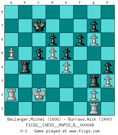 Last move : 0-1 2007 June 26 22:45:28 [Event "FICGS__CHESS__RAPID_B__000048"] [Site "FICGS"] [Date "2007.04.18"] [Round "1"] [White "Bellanger,Michel"] [Black "Burrows,Nick"] [Result "0-1"] [WhiteElo "1606"] [BlackElo "1400"] 1.e4 e5 2.Nf3 Nc6 3.Bb5 a6 4.Ba4 Nf6 5.O-O b5 6.Bb3 Bb7 7.d3 Be7 8.Nc3 O-O 9.Be3 d6 10.Nd5 Na5 11.Nxe7+ Qxe7 12.Nh4 Bc8 13.Qf3 Ng4 14.Qg3 Nxe3 15.fxe3 c6 16.c3 Nxb3 17.axb3 a5 18.Rf2 Ra7 19.Nf5 Bxf5 20.exf5 f6 21.Qh4 Rfa8 22.c4 Qd7 23.Rd1 Rb7 24.d4 Re8 25.d5 c5 26.Ra1 Ra7 27.Qh5 Rb8 28.Ra3 a4 29.e4 Qc7 30.bxa4 bxc4 31.Rf1 Qb7 32.Rh3 h6 33.Qg6 Qf7 34.Ra1 Rxb2 35.Rc3 Qxg6 36.fxg6 Rb4 37.a5 Kf8 38.Kf2 Ke7 39.h3 Kd7 40.Rc2 Kc7 41.Rca2 h5 42.Ke3 h4 43.Kf3 Rb3+ 44.Kf2 c3 45.Ke3 c2 46.Kd2 Rg3 47.Rg1 Rb7 48.Kxc2 Rb4 0-1 Ruy Lopez : Archangelsk (counterthrust) variation Kingside Castling by player White (move 5) Kingside Castling by player Black (move 8) Player Black won this chess game. Follow this game move after move (download)An attack on the wing should be met by play in the center. (Nimzovitch) Je mehr wir mit Computern analysieren, desto mehr glauben wir an Verteidigung. (Vladimir Kramnik) Un entendimiento minucioso de las típicas continuaciones de mate hacen de las mas complicadas combinaciones de sacrificio que conducen hacia ellas no solo no dificiles, sino casi un asunto de rutina. (Siegbert Tarrasch) Un journaliste : 'Vous préférez avoir une dame de plus sur l'échiquier ou au lit ?' Boris Spassky : 'Ca dépend de la position.' If only people were all showed a certain minimum level of niceness; if only people didn't retract verbal draw offers (without draw box ticked) on ficgs; if only people didn't kill; if only people didn't run concentration / extermination camps, if only people didn't drop nuclear bombs on Hiroshima and Nagasaki, and so on - it would be a much more beautiful world. But sadly, things are not so... (Normajean Yates)