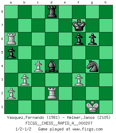 Last move : 1/2-1/2 2018 April 7 18:32:34 [Event "FICGS__CHESS__RAPID_A__000207"] [Site "FICGS"] [Date "2017.12.23"] [Round "1"] [White "Vasquez,Fernando"] [Black "Helmer,Janos"] [Result "1/2-1/2"] [WhiteElo "1981"] [BlackElo "2105"] 1.e4 c5 2.c3 Nf6 3.e5 Nd5 4.Nf3 d6 5.d4 cxd4 6.Qxd4 e6 7.Nbd2 Nc6 8.Bb5 Bd7 9.Bxc6 Bxc6 10.Nc4 dxe5 11.Ncxe5 Qb6 12.O-O Rc8 13.Qh4 Qc7 14.Nxc6 bxc6 15.c4 Nf6 16.Bh6 Qa5 17.Qf4 Qh5 18.Bg5 Be7 19.Qe5 Qg4 20.b3 O-O 21.Rad1 h6 22.h3 Qf5 23.Be3 Rfe8 24.Qxf5 exf5 25.Nd4 g6 26.Bxh6 Ne4 27.g3 Red8 28.Be3 Bc5 29.Kg2 a5 30.f3 Nc3 31.Rd2 Re8 32.Bg5 Kg7 33.g4 fxg4 34.hxg4 f6 35.Bh4 Kf7 36.Bf2 Rcd8 37.Rh1 Rd6 38.Rh7+ Kg8 39.Rc7 Red8 40.Rc2 Rxd4 41.Bxd4 Bxd4 42.Rxc6 Nd1 43.Rd2 Ne3+ 44.Kg1 Kf7 45.Ra6 Nxg4 1/2-1/2 Sicilian : Alapin's variation (2.c3) Kingside Castling by player White (move 12) Kingside Castling by player Black (move 20) This chess game ended in a draw. Follow this game move after move (download)Chess is as much a mystery as women. (Purdy) Kein Großmeister ist normal. Sie unterscheiden sich nur im Ausmaß Ihrer Verrücktheit. (Viktor Kortschnoi) La táctica fluye a partir de una posición superior. (Bobby Fischer) Toute estimation doit être constamment réévaluée. (Jacob Estrin) . 'gn is not allowed in chess unless n is an integer between 1 and 8 inclusive, where 1 and 8 are to interpreted as the standard numerals standing for integers in the ordered real-closed field R, with the *canonical* ordering. (As opposed to, say, an integer in the domain Z[2+i*sqrt(5)] or an integer in some exotic Grothendieck topos). (Normajean Yates)