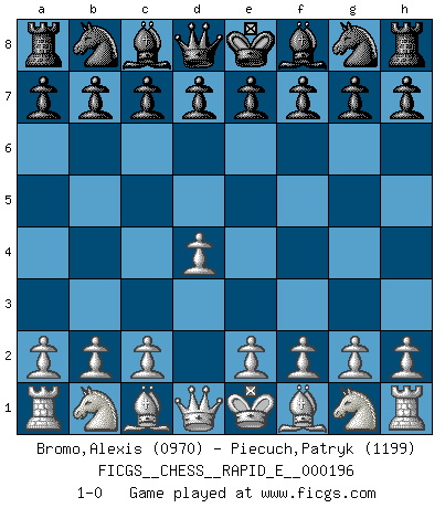 Last move : 1-0 2018 January 22 23:52:41 [Event "FICGS__CHESS__RAPID_E__000196"] [Site "FICGS"] [Date "2017.12.23"] [Round "1"] [White "Bromo,Alexis"] [Black "Piecuch,Patryk"] [Result "1-0"] [WhiteElo "0970"] [BlackElo "1199"] 1.d4 1-0 This chess game has been lost on time (started : 2017.12.23 17:28:12) Queen's pawn Player White won this chess game. Follow this game move after move (download)In Chess, at least, the brave inherit the earth. (Edmar Mednis) Im Hotelzimmer gab es nur zwei Schaben. (Über die Turnierbedingungen) (Peter Swidler) Vive, pierde y aprende al observar a tu oponente como gana. (Amber Steenbock) Les Echecs ne sont pas pour les âmes timides. Ils requièrent un homme entier, qui ne s'arrête pas aveuglément à ce qui a été déjà établi, mais qui tente individuellement de sonder les profondeurs du jeu. (W. Steinitz) Games, world of games... There's always an opponent, and there's always a victim. (Revolver, movie)