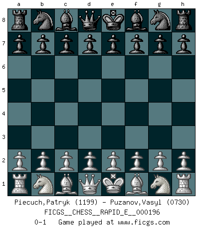 Last move : 0-1 2018 January 22 23:52:41 [Event "FICGS__CHESS__RAPID_E__000196"] [Site "FICGS"] [Date "2017.12.23"] [Round "1"] [White "Piecuch,Patryk"] [Black "Puzanov,Vasyl"] [Result "0-1"] [WhiteElo "1199"] [BlackElo "0730"] 0-1 This chess game has been lost on time (started : 2017.12.23 17:28:12) Player Black won this chess game. Follow this game move after move (download)The older I grow, the more I value Pawns. (Keres) Es hat in meinem Leben Zeiten gegeben, da ich sehr nahe daran war zu glauben, daß ich auch nicht eine einzige Schachpartie verlieren könnte. (José Raúl Capablanca) Aún deseo matar a Fischer. (Boris Spassky) Vous n'êtes pas toujours obligé de jouer le meilleur coup. Un coup doit être actif, entreprenant, correct et beau ! (David Bronstein) Now the reason the enlightened prince and the wise general conquer the enemy whenever they move and their achievements surpass those of ordinary men is foreknowledge. (Sun Tzu)