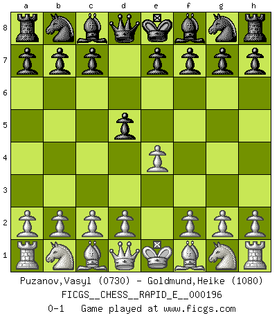 Last move : 0-1 2018 January 24 11:54:42 [Event "FICGS__CHESS__RAPID_E__000196"] [Site "FICGS"] [Date "2017.12.23"] [Round "1"] [White "Puzanov,Vasyl"] [Black "Goldmund,Heike"] [Result "0-1"] [WhiteElo "0730"] [BlackElo "1080"] 1.e4 d5 0-1 This chess game has been lost on time (started : 2017.12.23 17:28:12) Scandinavian (centre counter) defense Player Black won this chess game. Follow this game move after move (download)A big shock; the best chess player in history has passed away. (Lajos Portisch, about Bobby Fischer's death) Ich moechte nie einem Club beitreten, der Leute wie mich als Mitglieder aufnimmt. (Woody Allen) Nada excita más a Grandes Maestros aburridos que una novedad teórica. (Dominic Lawson) Toutes les manuvres exécutées sur une colonne ouverte ont pour but ultime l'intrusion définitive sur la septième ou la huitième rangée, en plein cur de la position ennemie. (Aaron Nimzovitch) The real voyage of discovery consists not in seeking new lands but in seeing with new eyes. (Marcel Proust)