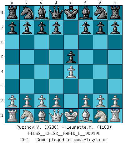 Last move : 0-1 2018 January 24 11:54:42 [Event "FICGS__CHESS__RAPID_E__000196"] [Site "FICGS"] [Date "2017.12.23"] [Round "1"] [White "Puzanov,Vasyl"] [Black "Leurette,Marc-Antoine"] [Result "0-1"] [WhiteElo "0730"] [BlackElo "1183"] 1.e4 e5 0-1 This chess game has been lost on time (started : 2017.12.23 17:28:12) King's pawn game Player Black won this chess game. Follow this game move after move (download)You need not play well - just help your opponent to play badly. (Genrikh Chepukaitis) Smyslow ist ein Beweis dafür, dass ich noch zehn Jahre spielen kann! [der 75 jährige über den 85 jährigen] (Viktor Kortschnoi) Fischer sacrificó virtualmente todo lo que la mayoría de nosotros los 'debiles' (término que él usa) valoramos, respetamos y apreciamos por el amor de un astuto, a menudo hermoso tablero de juego, por el privilegio ambivalente de ser su mas grande maestro. (Paul Kollar) Donnez-moi un Cavalier en 6e et je gagnerais toutes mes parties. (Steinitz) There are more things in heaven and earth than practically anywhere else. (Unknown)