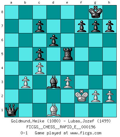 Last move : 0-1 2018 January 21 8:41:44 [Event "FICGS__CHESS__RAPID_E__000196"] [Site "FICGS"] [Date "2017.12.23"] [Round "1"] [White "Goldmund,Heike"] [Black "Lubas,Jozef"] [Result "0-1"] [WhiteElo "1080"] [BlackElo "1499"] 1.c4 e5 2.Nc3 Nf6 3.Nf3 Nc6 4.d4 exd4 5.Nxd4 Bb4 6.Nxc6 Bxc3+ 7.Bd2 Bxd2+ 8.Qxd2 bxc6 9.e3 O-O 10.Be2 Re8 11.O-O Ne4 12.Qd3 d6 13.Bf3 Bf5 14.Qd4 c5 15.Qd5 Qf6 16.b3 a5 17.Rac1 a4 18.Ra1 axb3 19.axb3 Rxa1 20.Rxa1 Qxa1+ 21.Bd1 Re5 22.Qd3 Nxf2 23.Kxf2 Bxd3 0-1 English Opening Kingside Castling by player Black (move 9) Kingside Castling by player White (move 11) Player Black won this chess game. Follow this game move after move (download)Methodical thinking is of more use in Chess than inspiration. (C. J. S. Purdy) Schach wird sich dank seiner hohen kulturellen Tradition immer durchsetzen. In näherer Zukunft womöglich sogar als Gegenreaktion auf die maßlose Reizüberflutung im Freizeit- und Spielbereich. (Garry Kasparov) a manera como él juega al Ajedrez, demuestra la completa naturaleza de un hombre. (Stanley Ellin) Vouloir jouer aux échecs contre soi-même est aussi paradoxal que vouloir marcher sur son ombre. (Stefan Zweig) Knowledge will give you power, but character respect. (Bruce Lee)