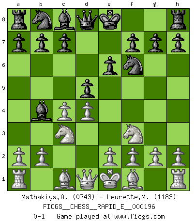 Last move : 0-1 2018 January 24 13:25:22 [Event "FICGS__CHESS__RAPID_E__000196"] [Site "FICGS"] [Date "2017.12.23"] [Round "1"] [White "Mathakiya,Azaz"] [Black "Leurette,Marc-Antoine"] [Result "0-1"] [WhiteElo "0743"] [BlackElo "1183"] 1.d4 d5 2.c4 e6 3.Nc3 Nf6 4.Nf3 Bb4 0-1 QGD : Ragozin variation Player Black won this chess game. Follow this game move after move (download)I thought the most common mistake [in chess] was the first one: Learning the game :P (Garvin Gray, FICGS forum) Schach ist ein Teil der Kultur, und wenn es mit der Kultur abwärts geht, geht es auch mit dem Schach abwärts. (Mikhail Moiseyevich Botvinik) El Ajedrez es un expediente tonto que hace creer a la gente inactiva que hacen una cosa muy astuta cuando solamente estan perdiendo su tiempo. (George Bernard Shaw) Les échecs, c'est l'imagination. (David Bronstein) To err is human, to shift the blame on someone else is tactical. (Mladen Jankovic)