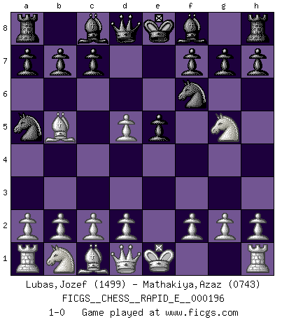 Last move : 1-0 2018 January 24 13:25:29 [Event "FICGS__CHESS__RAPID_E__000196"] [Site "FICGS"] [Date "2017.12.23"] [Round "1"] [White "Lubas,Jozef"] [Black "Mathakiya,Azaz"] [Result "1-0"] [WhiteElo "1499"] [BlackElo "0743"] 1.e4 e5 2.Nf3 Nc6 3.Bc4 Nf6 4.Ng5 d5 5.exd5 Na5 6.Bb5+ 1-0 Two knights defense Player White won this chess game. Follow this game move after move (download)On the chessboard, lies and hypocrisy do not survive long. (Emanuel Lasker) Mein Name ist Rustam Kamsky. Sie haben meinen Sohn belästigt. Bereiten Sie sich aufs Sterben vor. (Rustam Kamsky) Yo siempre he tenido un ligero sentimiento de lástima por una persona que no tiene conocimiento del Ajedrez. (Siegbert Tarrasch) Il vaut mieux sacrifier les pièces de l'adversaire. (Xavier Tartacover) Inventor: A person who makes an ingenious arrangement of wheels, levers and springs, and believes it civilization. (Ambrose Bierce, The Devil's Dictionary)