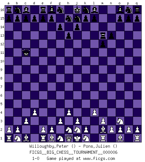 Last move : 1-0 2007 May 8 17:1:0 [Event "FICGS__BIG_CHESS__TOURNAMENT__000006"] [Site "FICGS"] [Date "2007.04.20"] [Round "1"] [White "Willoughby,Peter"] [Black "Pons,Julien"] [Result "1-0"] [WhiteElo ""] [BlackElo ""] 1.g2-g3 g15-g14 2.h3-h4 h16-c11 3.c2-c3 m15-m13 4.d2-d4 m13-m12 5.l2-l4 h14-h13 6.p1-o3 n15-n13 7.m2-m3 m16-m13 8.l1-m2 1-0 Follow this game move after move (download)You have to have the fighting spirit. You have to force moves and take chances. (Bobby Fischer) Intelligenz läßt sich nicht am Weg, sondern nur am Ergebnis feststellen. (Garry Kasparov) Si tu oponente no puede hacer nada activo, entonces no apures la posición; En vez de eso, dejalo estar sentado ahí, sufriendo y rogandote por un empate. (Jeremy Silman) Même si l'adversaire joue le coup analysé précédemment, recommencez l'analyse en voyant la nouvelle position. Première règle de Blumenfeld Programmer - an organism that turns coffee into software. (Anonymous)