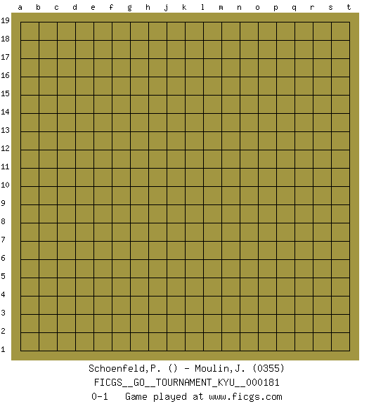 Last move : 0-1 2018 February 12 2:8:37 [Event "FICGS__GO__TOURNAMENT_KYU__000181"] [Site "FICGS"] [Date "2018.01.12"] [Round "1"] [Black "Schoenfeld,Peter"] [White "Moulin,Jean-Fred"] [Result "0-1"] [Rating 2 "0355"] 0-1 This go game has been lost on time (started : 2018.01.12 15:27:58) Here are the names of the openings (joseki) played in the four corners : Player White won this Go (weiqi, baduk) game. Follow this game move after move (download)If there is no stone on the handicap point, the carpenter's square is dead. (Anonymous) Any activity becomes creative when the doer cares about doing it right or doing it better. (John Updike)