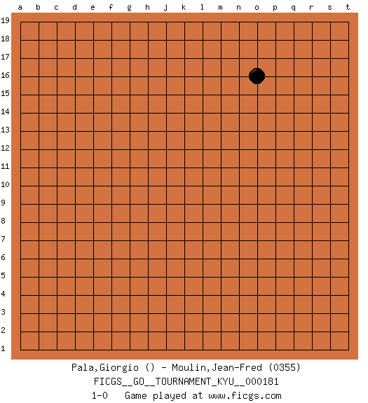 Last move : 1-0 2018 March 4 4:5:39 [Event "FICGS__GO__TOURNAMENT_KYU__000181"] [Site "FICGS"] [Date "2018.01.12"] [Round "1"] [Black "Pala,Giorgio"] [White "Moulin,Jean-Fred"] [Result "1-0"] [Rating 2 "0355"] 1.o16 1-0 This go game has been lost on time (started : 2018.01.12 15:27:58) Here are the names of the openings (joseki) played in the four corners : Player Black won this Go (weiqi, baduk) game. Follow this game move after move (download)There are players who don't accept exchange: they play many moves that perpetuate a previous state of the game. (Pierre Audouard) I can't decide which is riskier; taking crazy risks, or taking advice on crazy risks from a crazy risk taker. (Gregory House in House M.D.)