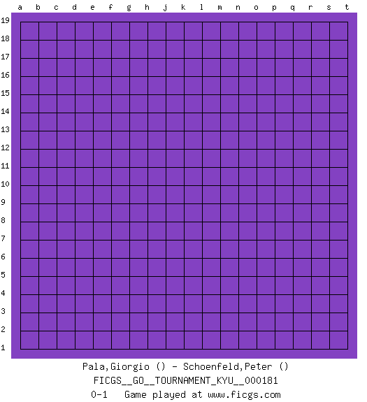 Last move : 0-1 2018 January 25 11:54:41 [Event "FICGS__GO__TOURNAMENT_KYU__000181"] [Site "FICGS"] [Date "2017.12.26"] [Round "1"] [Black "Pala,Giorgio"] [White "Schoenfeld,Peter"] [Result "0-1"] 0-1 This go game has been lost on time (started : 2017.12.26 10:53:59) Here are the names of the openings (joseki) played in the four corners : Player White won this Go (weiqi, baduk) game. Follow this game move after move (download)With less than 15 stones in danger, tenuki. (Anonymous) Players are not good because they find tactics, it is about the way to find the positions in which those tactics are hidden. (Luc-Olivier Leclerc)