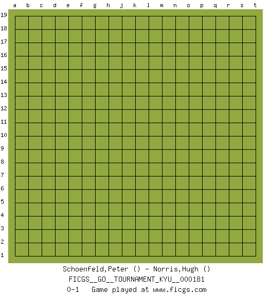 Last move : 0-1 2018 February 12 2:8:37 [Event "FICGS__GO__TOURNAMENT_KYU__000181"] [Site "FICGS"] [Date "2018.01.12"] [Round "1"] [Black "Schoenfeld,Peter"] [White "Norris,Hugh"] [Result "0-1"] 0-1 This go game has been lost on time (started : 2018.01.12 15:30:3) Here are the names of the openings (joseki) played in the four corners : Player White won this Go (weiqi, baduk) game. Follow this game move after move (download)The weak player fears ko, the strong player seeks it. (Bill Taylor) Beta. Software undergoes beta testing shortly before it's released. Beta is latin for still doesn't work. (Anonymous)
