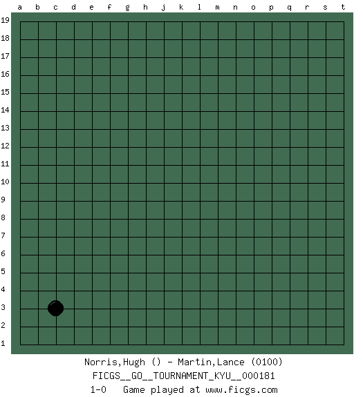Last move : 1-0 2018 February 12 2:8:37 [Event "FICGS__GO__TOURNAMENT_KYU__000181"] [Site "FICGS"] [Date "2018.01.12"] [Round "1"] [Black "Norris,Hugh"] [White "Martin,Lance"] [Result "1-0"] [Rating 2 "0100"] 1.c3 1-0 This go game has been lost on time (started : 2018.01.12 15:31:53) Here are the names of the openings (joseki) played in the four corners : Corner d4 : c3 1-0 San-San (Sam-Sam, San-San) 3-3 Point. The San-San (3-3) point, emphasizing territory at the expense of influence. Player Black won this Go (weiqi, baduk) game. Follow this game move after move (download)Keshi is worth as much as an invasion ! (Anonymous) Always remember that you are unique; just like everyone else. (Unknown)