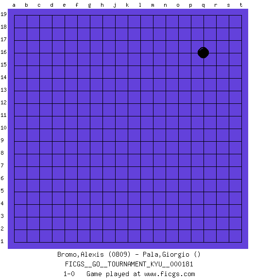 Last move : 1-0 2018 January 25 11:54:41 [Event "FICGS__GO__TOURNAMENT_KYU__000181"] [Site "FICGS"] [Date "2017.12.26"] [Round "1"] [Black "Bromo,Alexis"] [White "Pala,Giorgio"] [Result "1-0"] [Rating 1 "0809"] 1.q16 1-0 This go game has been lost on time (started : 2017.12.26 10:53:59) Here are the names of the openings (joseki) played in the four corners : Player Black won this Go (weiqi, baduk) game. Follow this game move after move (download)One big eye kills one small eye. (Anonymous) Fame, I have already. Now I need the money. (an elderly Steinitz)