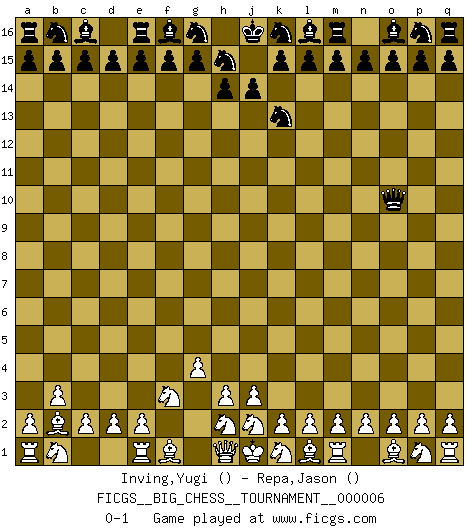 Last move : 0-1 2007 April 28 5:37:18 [Event "FICGS__BIG_CHESS__TOURNAMENT__000006"] [Site "FICGS"] [Date "2007.04.20"] [Round "1"] [White "Inving,Yugi"] [Black "Repa,Jason"] [Result "0-1"] [WhiteElo ""] [BlackElo ""] 1.g2-g4 j15-k13 2.b2-b3 h16-o10 3.c1-b2 o10-f2 4.g1-f3 f2-o10 0-1 Follow this game move after move (download)Good positions don't win games, good moves do. (Gerald Abrahams) Wenn ich einen Club besuche, sind die Spieler stumm vor Staunen. (José Raúl Capablanca) Cuando tu no sabes absolutamente que mas hacer, es tiempo de entrar en pánico. (John van der Wiel) Je crois qu'il existe des manières très spécifiques de jouer efficacement contre une machine. Evidemment, nous n'avons aucune chance en technique pure, parce que l'ordinateur calcule de manière parfaite. Mais lorsque nous faisons appel à notre cerveau, en utilisant l'intuition et la compréhension, alors nous restons beaucoup plus forts. (Anatoli Karpov) I would love to change the world, but they won't give me the source code. (Unknown)