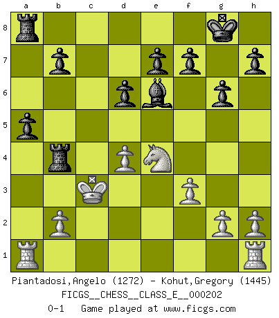Last move : 0-1 2018 March 19 23:34:51 [Event "FICGS__CHESS__CLASS_E__000202"] [Site "FICGS"] [Date "2017.12.31"] [Round "1"] [White "Piantadosi,Angelo"] [Black "Kohut,Gregory"] [Result "0-1"] [WhiteElo "1272"] [BlackElo "1445"] 1.e4 c5 2.Nf3 Nc6 3.d4 cxd4 4.Nxd4 g6 5.Nc3 Bg7 6.Be3 Nf6 7.f3 O-O 8.Bc4 Qb6 9.Bb3 Nxe4 10.Nxe4 Bxd4 11.Bxd4 Nxd4 12.c3 Nxb3 13.axb3 d6 14.b4 Be6 15.Qd4 Qxd4 16.cxd4 Rfc8 17.Kd2 Rc4 18.Kd3 Rxb4 19.Kc3 a5 0-1 Sicilian : Accelerated Fianchetto, Modern variation Kingside Castling by player Black (move 7) Player Black won this chess game. Follow this game move after move (download)What is the object of playing a gambit opening?... To acquire a reputation of being a dashing player at the cost of losing a game. (Siegbert Tarrasch) Über die Verhaftung Bobby Fischers: Warum es die Bush-Administration für nötig befindet einen 61 Jahre alten Mann zu hetzten, der für niemanden ausser sich selbste eine Gefahr darstellt ist ein Rätsel. (Nigel Short) El Ajedrez es un invernadero donde los frutos del carácter pueden madurar mas completamente que en la vida. (Edward Morgan Foster) Dieu déplace le joueur, et celui-ci la pièce. Quel Dieu derrière Dieu commence donc la trame ? Arturo Perez-Reverte (prix de littérature policière 1993). Ah, beer! The cause of, and the solution to, all of life's problems. (Homer Simpson)