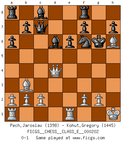 Last move : 0-1 2018 June 27 4:11:56 [Event "FICGS__CHESS__CLASS_E__000202"] [Site "FICGS"] [Date "2017.12.31"] [Round "1"] [White "Pech,Jaroslav"] [Black "Kohut,Gregory"] [Result "0-1"] [WhiteElo "1398"] [BlackElo "1445"] 1.e4 e6 2.d4 d5 3.Nd2 c5 4.exd5 Qxd5 5.Ngf3 cxd4 6.Bc4 Qd6 7.O-O Nf6 8.Nb3 Nc6 9.Nbxd4 Nxd4 10.Nxd4 a6 11.Bb3 Qc7 12.Re1 Bd6 13.Nf5 Bxh2+ 14.Kh1 O-O 15.Nxg7 Kxg7 16.Qd4 Bd6 17.Bh6+ Kg6 0-1 This chess game has been lost on time (started : 2017.12.31 0:14:13) French : Tarrasch, Open variation Kingside Castling by player White (move 7) Kingside Castling by player Black (move 14) Player Black won this chess game. Follow this game move after move (download)He who fears an isolated Queen's Pawn should give up Chess. (Siegbert Tarrasch) Ich habe die Schachforschung dermaßen betrieben, dass sie auf eine wissenschaftliche Basis gestellt wurde. (Mikhail Moiseyevich Botvinik) Cuando me preguntan: -¿Cual es el secreto que te hace hacer mejores movidas que tus oponentes?, Yo respondo: Me da gusto que me pregunten eso, porque, como veran, hay una simple razón. Yo pienso mis propias movidas y dejo a mi oponente que el piense las suyas. (Alexander Alekhine) La solitude du joueur d'Echecs à l'approche du mat est semblable à celle du condamné. (Francis Szpiner) Life is pain my dear and anyone who says otherwise is selling something. (Princess Bride)