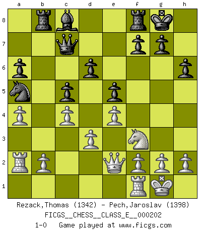 Last move : 1-0 2018 May 23 23:51:23 [Event "FICGS__CHESS__CLASS_E__000202"] [Site "FICGS"] [Date "2017.12.31"] [Round "1"] [White "Rezack,Thomas"] [Black "Pech,Jaroslav"] [Result "1-0"] [WhiteElo "1342"] [BlackElo "1398"] 1.e4 e5 2.Nf3 Nc6 3.Bb5 a6 4.Ba4 Nf6 5.Nc3 b5 6.Bb3 Be7 7.d3 d6 8.a4 b4 9.Nd5 Na5 10.Nxf6+ Bxf6 11.Bd5 c6 12.Ba2 Rb8 13.O-O O-O 14.Bd2 c5 15.Qe2 Qc7 16.Bg5 Bxg5 17.Nxg5 b3 18.c4 bxa2 19.Rxa2 h6 20.Nf3 1-0 This chess game has been lost on time (started : 2017.12.31 0:14:13) Ruy Lopez : Four knights (Tarrasch) variation Kingside Castling by player White (move 13) Kingside Castling by player Black (move 13) Player White won this chess game. Follow this game move after move (download)Modern Chess is too much concerned with things like Pawn structure. Forget it, Checkmate ends the game. (Nigel Short) Man gibt nur Pakete auf. (Paul Keres) Nunca nadie ha ganado una partida de Ajedrez rindiendose. (Unknown) Les sacrifices démontrent seulement que quelqu'un a gaffé. (Savielly Tartacover) There's no money in correspondence chess. (John Knudsen)