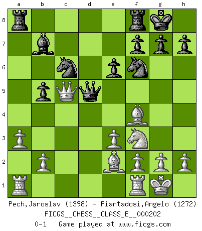 Last move : 0-1 2018 May 12 4:11:59 [Event "FICGS__CHESS__CLASS_E__000202"] [Site "FICGS"] [Date "2017.12.31"] [Round "1"] [White "Pech,Jaroslav"] [Black "Piantadosi,Angelo"] [Result "0-1"] [WhiteElo "1398"] [BlackElo "1272"] 1.d4 d5 2.c4 e6 3.Nc3 Nf6 4.Nf3 Be7 5.Bf4 O-O 6.e3 dxc4 7.Bxc4 a6 8.Be2 c5 9.dxc5 Bxc5 10.O-O Nc6 11.a3 b5 12.Qc2 Bb7 13.Nxb5 axb5 14.Qxc5 Qd5 0-1 This chess game has been lost on time (started : 2017.12.31 0:14:13) QGD : Classical variation (5.Bf4) Kingside Castling by player Black (move 5) Kingside Castling by player White (move 10) Player Black won this chess game. Follow this game move after move (download)Chess is a more highly symbolic game, but the aggressions are therefore even more frankly represented in the play. It probably began as a war game; that is, the representation of a miniature battle between the forces of two kingdoms. (Karl Meninger) Dieses schreckliche Gefühl, dass ich gegen eine Maschine spielte, die niemals Fehler macht, zerschmetterte meinen Widerstand. (Mark Taimanov) El jugador blanco perdió porque fallo en recordar la coreccta continuación y tuvo que pensar por sí mismo las movidas. (Siegbert Tarrasch) Je menace de comprendre la position. (Anonyme) Perhaps chess is the wrong game for the times (The Chess Master and the Computer, by Garry Kasparov - 2010)