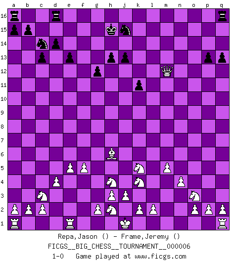 Last move : 1-0 2007 April 27 13:29:40 [Event "FICGS__BIG_CHESS__TOURNAMENT__000006"] [Site "FICGS"] [Date "2007.04.20"] [Round "1"] [White "Repa,Jason"] [Black "Frame,Jeremy"] [Result "1-0"] [WhiteElo ""] [BlackElo ""] 1.j2-k4 k15-k13 2.h1-o7 p16-o14 3.o7-f15 e16-d16 4.f15-k11 n15-n14 5.k11-g11 d15-d14 6.g11-l15 o16-n15 7.m2-m4 k16-l14 8.l15-c7 c15-c13 9.e2-e4 b16-c14 10.n2-n4 g15-g13 11.d2-d4 e15-e13 12.g1-j2 j14-j13 13.o1-j6 l16-j14 14.c1-h6 c16-j10 15.f1-c4 j10-c4 16.c7-c4 g16-f14 17.b1-c3 m15-m13 18.p1-o3 k13-k12 19.m4-m5 j14-l12 20.j6-g8 l12-g8 21.c4-g8 h14-h13 22.e4-e5 j15-k13 23.l1-p5 n15-l13 24.k1-l3 f16-e15 25.f2-f4 g13-g12 26.g8-p8 p15-p14 27.p8-k13 l14-m12 28.k13-o9 o14-n12 29.o9-o15 m16-o16 30.o15-l15 o16-l16 31.l15-q10 h15-g13 32.p5-g13 h16-h15 33.j2-h4 l13-m14 34.q10-k10 f14-g16 35.g13-e15 h15-e15 36.k10-m12 m14-l13 37.m12-n13 g16-j15 38.n13-n14 l16-m16 39.f4-f5 p14-p13 40.l3-k5 q15-q13 41.n14-q11 e15-k10 42.m1-m3 k12-k11 43.m3-l3 k10-l11 44.l3-l11 n12-l11 45.q11-l11 m13-m12 46.l11-l13 m16-m13 47.l13-m13 j16-h15 48.m13-m12 1-0 Follow this game move after move (download)Help your pieces so they can help you. (Paul Morphy) Im Blitz ist es einfacher mit einer Figur weniger anzugreifen, als sich mit einer Mehrfigur zu verteidigen. (Mikhail Nekhemyevich Tal) En partidas rápidas, el Caballo es mas poderoso que el Alfil. (Vlastimil Hort) Il n'y a pas eu de défaite parce que je ne crois pas que cet ordinateur ait jamais existé. IBM a triché en refusant d'imprimer les modes de recherche de la machine. C'est évident, pendant le match, des coups décisifs ont été joués par des êtres humains. Aujourd'hui, les meilleurs spécialistes en informatique ne peuvent toujours pas expliquer comment Deep-Blue a pu jouer contre la logique des ordinateurs. IBM a gagné une guerre de communication, mais ils sont incapables de prouver que l'ordinateur a gagné tout seul. (Garry Kasparov) Fame, I have already. Now I need the money. (an elderly Steinitz)