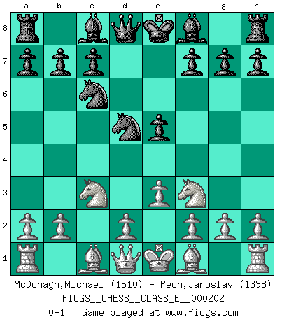 Last move : 0-1 2018 March 18 17:46:41 [Event "FICGS__CHESS__CLASS_E__000202"] [Site "FICGS"] [Date "2017.12.31"] [Round "1"] [White "McDonagh,Michael"] [Black "Pech,Jaroslav"] [Result "0-1"] [WhiteElo "1510"] [BlackElo "1398"] 1.c4 e5 2.Nc3 Nf6 3.Nf3 Nc6 4.e3 d5 5.cxd5 Nxd5 0-1 This chess game has been lost on time (started : 2017.12.31 0:14:13) English Opening Player Black won this chess game. Follow this game move after move (download)War is the child of passion, passion is the child of narcissism and narcissism is the child. (...) Another game ? (Thibault de Vassal) Ich war zu klein für die Schach-Schülermannschaft! (Woody Allen) No soy una persona materialista y por eso, no resiento la falta o pérdida del dinero. La ausencia de cosas mundanas carece de importancia. Ya que el Ajedrez es una forma en la que puedo ser tan materialista como yo desee sin tener la necesidad de vender mi alma. (Jamie Walter Adams) Pour se monter efficace, un Cavalier a besoin d'avant-postes ! Les Cavaliers font les meilleurs bloqueurs de pions passés. The various flowers seem good to different people. (Chinese proverb)