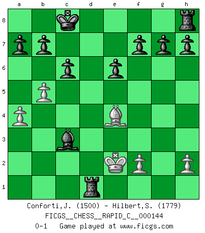 Last move : 0-1 2018 May 14 23:17:28 [Event "FICGS__CHESS__RAPID_C__000144"] [Site "FICGS"] [Date "2018.01.02"] [Round "1"] [White "Conforti,John"] [Black "Hilbert,Stephan J."] [Result "0-1"] [WhiteElo "1500"] [BlackElo "1779"] 1.e4 d5 2.exd5 Qxd5 3.Nc3 Qa5 4.d4 Nf6 5.Bd3 c6 6.Nf3 Bg4 7.O-O Nbd7 8.Qe1 Bxf3 9.gxf3 e6 10.Bf4 Qb6 11.Na4 Qxd4 12.Bg3 Qxa4 13.b3 Qa3 14.c3 Nc5 15.Bc2 Qb2 16.Qc1 Qxc3 17.Rd1 Qxf3 18.Qf4 Qxf4 19.Bxf4 Nd5 20.Bd2 Bd6 21.b4 Na6 22.a3 Nac7 23.Rab1 Nb5 24.Rb3 Nd4 25.Rb2 Be5 26.Be4 Ne2+ 27.Kf1 Bxb2 28.Kxe2 O-O-O 29.a4 Nc3+ 30.Bxc3 Bxc3 31.b5 Rxd1 0-1 This chess game has been lost on time (started : 2018.01.02 11:47:37) Scandinavian (centre counter) defense Kingside Castling by player White (move 7) Queenside Castling by player Black (move 28) Player Black won this chess game. Follow this game move after move (download)At this time Fischer is simply a level above all the best Chessplayers in the world. (John Jacobs) Obwohl ich vom Stil her kaum zu den Priestern der Schachkunst gezählt werde, halte ich Schach doch für eine Kunst. (Tigran Petrosjan) Cuando la partida de Ajedrez termina, el Peón y el Rey regresan a la misma caja. (Irish saying) L'ordinateur a tué l'originalité. Il n'y a plus guère d'aventures sur l'échiquier. (Jacob Murray) Now the reason the enlightened prince and the wise general conquer the enemy whenever they move and their achievements surpass those of ordinary men is foreknowledge. (Sun Tzu)