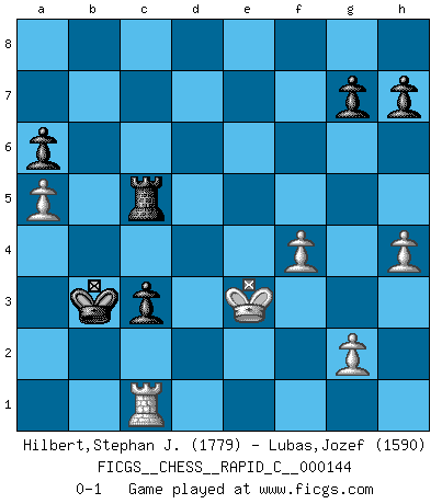 Last move : 0-1 2018 April 6 1:29:53 [Event "FICGS__CHESS__RAPID_C__000144"] [Site "FICGS"] [Date "2018.01.02"] [Round "1"] [White "Hilbert,Stephan J."] [Black "Lubas,Jozef"] [Result "0-1"] [WhiteElo "1779"] [BlackElo "1590"] 1.b4 e5 2.Bb2 Bxb4 3.Bxe5 Nf6 4.c4 Nc6 5.Bb2 O-O 6.e3 d5 7.cxd5 Nxd5 8.a3 Be7 9.Nf3 Na5 10.Be2 Bf5 11.Nc3 Nb6 12.d3 c5 13.O-O Bf6 14.Qc2 Rc8 15.Rad1 a6 16.Ba1 Re8 17.Qa2 Be6 18.Qb1 Nb3 19.Bb2 Bxc3 20.Bxc3 Na4 21.Be1 b5 22.Qc2 Qf6 23.Rb1 c4 24.dxc4 bxc4 25.e4 Nac5 26.Rd1 Qf4 27.Nd4 Qxe4 28.Qxe4 Nxe4 29.Nxe6 fxe6 30.f3 Nf6 31.Rf2 Nd5 32.Rb1 Nd4 33.Rd1 Nxe2+ 34.Rxe2 c3 35.Bg3 Rc5 36.Kf2 Rec8 37.Rc1 Ra5 38.Bd6 Rc6 39.Rxe6 Kf7 40.Bb4 Nxb4 41.axb4 Kxe6 42.bxa5 Kd5 43.h4 Rc5 44.Ke3 Kc4 45.f4 Kb3 0-1 Polish (Sokolsky) opening Kingside Castling by player Black (move 5) Kingside Castling by player White (move 13) Player Black won this chess game. Follow this game move after move (download)Examine moves that smite! A good eye for smites is far more important than a knowledge of strategical principles. (Purdy) Ich bin es gewohnt, das die Jugend mir überhaupt keinen Respekt entgegenbringt. (Alexander Morozewich) La estratégia requiere pensar, la táctica requiere observación. (Max Euwe) Les échecs, c'est la lutte contre l'erreur. (Johannes Zukertort) Winning isn't everything... but losing is nothing. (Mednis)