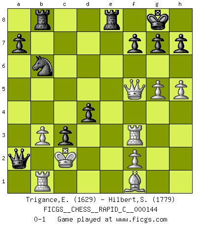Last move : 0-1 2018 March 13 8:58:55 [Event "FICGS__CHESS__RAPID_C__000144"] [Site "FICGS"] [Date "2018.01.02"] [Round "1"] [White "Trigance,Emile"] [Black "Hilbert,Stephan J."] [Result "0-1"] [WhiteElo "1629"] [BlackElo "1779"] 1.e4 d5 2.exd5 Qxd5 3.Nc3 Qa5 4.d4 Nf6 5.Nf3 Bg4 6.h3 Bh5 7.g4 Bg6 8.Ne5 e6 9.Bg2 c6 10.h4 Nbd7 11.Nc4 Qa6 12.Bf1 b5 13.h5 Bxc2 14.Qxc2 bxc4 15.g5 Nd5 16.Qe4 Bb4 17.Bd2 Rb8 18.Rb1 O-O 19.Rh3 e5 20.Nxd5 cxd5 21.Qxd5 Nb6 22.Qf3 Bxd2+ 23.Kxd2 exd4 24.Qf5 Rfe8 25.Rf3 c3+ 26.Kc2 Qa4+ 27.b3 Qxa2+ 0-1 Scandinavian defense, Lasker variation Kingside Castling by player Black (move 18) Player Black won this chess game. Follow this game move after move (download)On the chessboard, lies and hypocrisy do not survive long. (Emanuel Lasker) Spielt Blackmar-Diemer-Gambit, und das Matt kommt von selbst! (Emil Joseph Diemer) Evita las multitudes. Haz independientemente tu propio razonamiento. Trata de ser el jugador de Ajedrez, no la pieza de Ajedrez. (Ralph Charell) Les échecs sont un jeu par leur forme, un art par leur essence et une science par sa difficulté d'acquisition. Ils peuvent vous procurer autant de plaisir qu'un bon livre ou une belle musique, mais vous n'aurez une réelle joie que si vous arrivez à bien jouer. (Tigran Petrosian) There is far too much law for those who can afford it and far too little for those who cannot. (Derek Bok)
