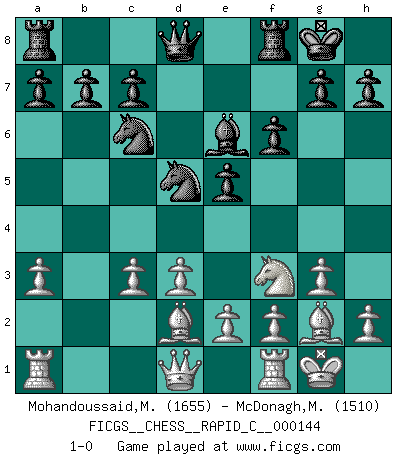 Last move : 1-0 2018 February 24 15:23:33 [Event "FICGS__CHESS__RAPID_C__000144"] [Site "FICGS"] [Date "2018.01.02"] [Round "1"] [White "Mohandoussaid,Malik"] [Black "McDonagh,Michael"] [Result "1-0"] [WhiteElo "1655"] [BlackElo "1510"] 1.c4 e5 2.Nc3 Nf6 3.d3 Nc6 4.Nf3 Bb4 5.g3 O-O 6.Bg2 d5 7.cxd5 Nxd5 8.Bd2 Be6 9.O-O f6 10.a3 Bxc3 11.bxc3 1-0 This chess game has been lost on time (started : 2018.01.02 11:47:37) English Opening Kingside Castling by player Black (move 5) Kingside Castling by player White (move 9) Player White won this chess game. Follow this game move after move (download)Winning isn't everything... but losing is nothing. (Mednis) Im Fernschach kannst du während dem Spiel rauchen. (John Christen Knudsen) Es muy difícil jugar en contra de la teoría de Einstein. - en su primera derrota en contra de Fischer (Mikhail Tal) Mais l'homme est une créature légère et illogique : semblable au joueur d'échecs, il n'aime que le processus du but à atteindre, non le but lui-même. (Dostoïevsky) Any activity becomes creative when the doer cares about doing it right or doing it better. (John Updike)