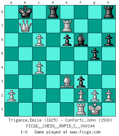 Last move : 1-0 2018 January 20 8:0:41 [Event "FICGS__CHESS__RAPID_C__000144"] [Site "FICGS"] [Date "2018.01.02"] [Round "1"] [White "Trigance,Emile"] [Black "Conforti,John"] [Result "1-0"] [WhiteElo "1629"] [BlackElo "1500"] 1.e4 e5 2.Bc4 d6 3.Nf3 Be6 4.Bxe6 fxe6 5.d4 Nc6 6.O-O Qe7 7.dxe5 h6 8.exd6 cxd6 9.c4 O-O-O 10.Nc3 a6 11.Qa4 g5 12.Be3 Nf6 13.b4 d5 14.b5 Nxe4 15.Nxe4 Bg7 16.Rab1 dxe4 17.bxc6 exf3 18.Rxb7 Be5 19.Rxe7 Bf6 20.Qxa6+ Kb8 21.Qb7+ 1-0 Bishop's Opening Kingside Castling by player White (move 6) Queenside Castling by player Black (move 9) Player White won this chess game. Follow this game move after move (download)Life is like a game of Chess, changing with each move. (Chinese proverb) Wenn ich Weiß habe gewinne ich weil ich Weiß habe, wenn ich Schwarz habe gewinne ich weil ich Bogoljubov bin. (Efim Bogoljubov) Yo no le temo a Spassky. Todos saben que yo soy el mejor. Uno no necesita un torneo para probarlo. (Bobby Fischer) Vous m'avez demandé de vous exposer quel est le fondement de la prière. Je ne fais que préparer les pièces du jeu sur la table... Nous sera-t-il permis d'en adopter les règles et si nous les appliquons scrupuleusement nous ne tarderons pas à faire mat le Roi divin ! Il ne pourra échapper à nos mains. (Sainte Thérèse d'Avila, Chemin de perfection) 'preceded by its own quotation yields a falsehood' preceded by its own quotation yields a falsehood. (W. V. O. Quine - Set Theory And Its Logic, 1953)