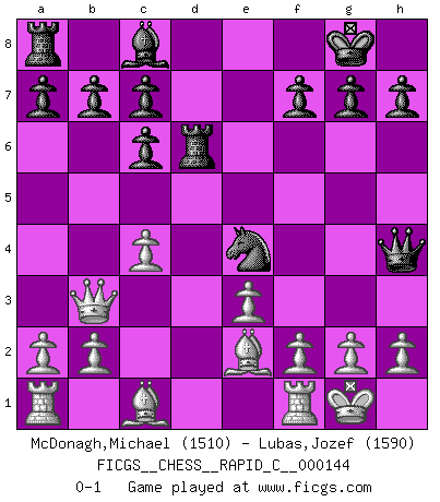 Last move : 0-1 2018 February 17 2:26:41 [Event "FICGS__CHESS__RAPID_C__000144"] [Site "FICGS"] [Date "2018.01.02"] [Round "1"] [White "McDonagh,Michael"] [Black "Lubas,Jozef"] [Result "0-1"] [WhiteElo "1510"] [BlackElo "1590"] 1.c4 e5 2.Nc3 Nf6 3.Nf3 Nc6 4.e3 Bb4 5.Qc2 Bxc3 6.Qxc3 Qe7 7.d4 Ne4 8.Qd3 exd4 9.Nxd4 O-O 10.Nxc6 dxc6 11.Be2 Rd8 12.Qb3 Qh4 13.O-O Rd6 0-1 This chess game has been lost on time (started : 2018.01.02 11:47:37) English Opening Kingside Castling by player Black (move 9) Kingside Castling by player White (move 13) Player Black won this chess game. Follow this game move after move (download)If Chess is a science, it's a most inexact one. If Chess is an art, it is too exacting to be seen as one. If Chess is a sport, it's too esoteric. If Chess is a game, it's too demanding to be just a game. If Chess is a mistress, she's a demanding one. If Chess is a passion, it's a rewarding one. If Chess is life, it's a sad one. (Unknown) Der Vorposten provoziert a) eine Basis für neue Angriffe und b) eine Schwächung der gegnerischen Widerstandskraft in der fraglichen Linie. (Aaron Nimzowitsch) En el Ajedrez, tal como en la vida, las bendiciones de hoy pueden ser el veneno del mañana. (Assaic) Les réformistes prétendent que les progrès de la théorie conduiront à la disparition des échecs, et qu'il faut, pour leur rendre vie, en remanier les règles. En réalité, qu'exprime cette affirmation? Le mépris de l'intuition, de l'imagination et de tous les autres éléments qui font des échecs un art. (Alexander Alekhine) Knowledge rests not upon truth alone, but upon error also. (Carl G. Jung)