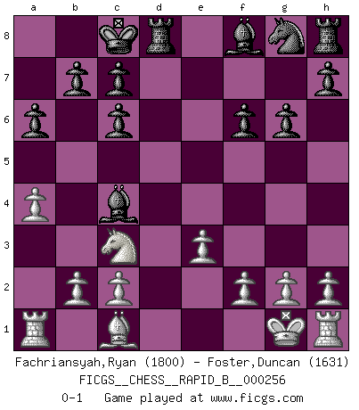 Last move : 0-1 2018 April 3 20:3:0 [Event "FICGS__CHESS__RAPID_B__000256"] [Site "FICGS"] [Date "2018.01.31"] [Round "1"] [White "Fachriansyah,Ryan"] [Black "Foster,Duncan"] [Result "0-1"] [WhiteElo "1800"] [BlackElo "1631"] 1.e4 e5 2.Nf3 Nc6 3.Bb5 a6 4.Bxc6 dxc6 5.Nxe5 Qd4 6.Qh5 Qxe4+ 7.Kf1 g6 8.Qg5 f6 9.Qe3 Qxe5 10.Nc3 Qxe3 11.dxe3 Be6 12.a4 Bc4+ 13.Kg1 O-O-O 0-1 This chess game has been lost on time (started : 2018.01.31 15:43:16) Ruy Lopez : Exchange variation Queenside Castling by player Black (move 13) Player Black won this chess game. Follow this game move after move (download)I'm not a materialistic person, in that, I don't suffer the lack or loss of money. The absence of worldly goods I don't look back on. For Chess is a way I can be as materialistic as I want without having to sell my soul. (Jamie Walter Adams) Ich würde die 30 stärksten Spieler der USA im Simultanspiel besiegen. (José Raúl Capablanca) Yo adoro todas la posiciones. Denme una partida posicional difícil, y la jugaré. Pero posiciones totalmente ganadas, no las tolero. (Hein Donner) Le temps de noter son nom sur la feuille de partie, j'étais déjà en zeitnot ! D'un modeste amateur apparié lors de la première ronde d'un open contre le grand-maître Azmaïparashvili. Man is still the most extraordinary computer of all. (John F. Kennedy)
