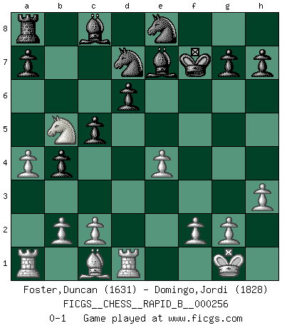 Last move : 0-1 2018 January 27 0:16:20 [Event "FICGS__CHESS__RAPID_B__000256"] [Site "FICGS"] [Date "2018.01.04"] [Round "1"] [White "Foster,Duncan"] [Black "Domingo,Jordi"] [Result "0-1"] [WhiteElo "1631"] [BlackElo "1828"] 1.e4 e5 2.Nf3 d6 3.d4 Nf6 4.Nc3 Nbd7 5.Bc4 Be7 6.Ng5 O-O 7.Bxf7+ Rxf7 8.Nxf7 Kxf7 9.O-O exd4 10.Qxd4 c6 11.h3 Qb6 12.Rd1 Qxd4 13.Rxd4 b5 14.a4 c5 15.Rd1 b4 16.Nb5 Ne8 0-1 Philidor : Nimzovich, Larobok variation Kingside Castling by player Black (move 6) Kingside Castling by player White (move 9) Player Black won this chess game. Follow this game move after move (download)Fischer is an American Chess tragedy on par with Morphy and Pillsbury. (Mig Greengard) Dein Körper muss in Topform sein. Dein Schach verfällt, wenn dein Körper verfällt. Der Körper kann nicht vom Geist getrennt werden. (Robert James Fischer) El arma más poderosa en el Ajedrez, es tener la próxima movida. (David Bronstein) Les Echecs sont et restent toujours un combat, un combat intégral comme la boxe, la lutte ou un autre sport, et où il doit y avoir un vainqueur et un vaincu. (Joseph Emil Diemer) Follow your passion, and success will follow you. (Arthur Buddhold)