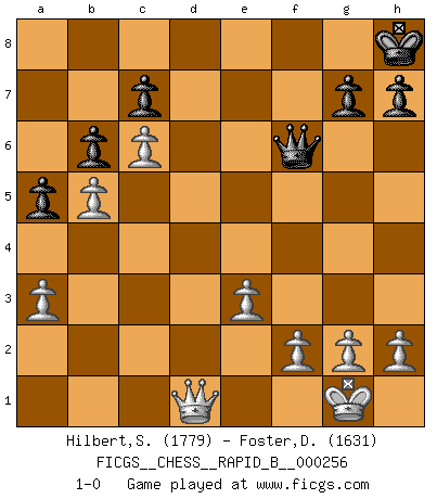 Last move : 1-0 2018 April 25 13:3:57 [Event "FICGS__CHESS__RAPID_B__000256"] [Site "FICGS"] [Date "2018.01.04"] [Round "1"] [White "Hilbert,Stephan J."] [Black "Foster,Duncan"] [Result "1-0"] [WhiteElo "1779"] [BlackElo "1631"] 1.b4 f5 2.Bb2 e6 3.e3 Nf6 4.a3 Be7 5.Nf3 O-O 6.Be2 a5 7.b5 b6 8.c4 d5 9.Qc2 Bb7 10.Nc3 Nbd7 11.Ng5 Nc5 12.d4 Nfe4 13.Ncxe4 fxe4 14.dxc5 Bxg5 15.c6 Bc8 16.Rd1 Bf6 17.cxd5 exd5 18.Rxd5 Qe7 19.O-O Be6 20.Bxf6 Qxf6 21.Rd4 Bf5 22.Bc4+ Kh8 23.Bd5 Rae8 24.Bxe4 Rxe4 25.Rxe4 Rd8 26.Qc4 Bxe4 27.Qxe4 Rf8 28.Qg4 Rd8 29.Rd1 Rxd1+ 30.Qxd1 1-0 Polish (Sokolsky) opening Kingside Castling by player Black (move 5) Kingside Castling by player White (move 19) Player White won this chess game. Follow this game move after move (download)Bobby Fischer is the greatest Chess genius of all time ! (Alexander Kotov) Die Partien sind immer verschieden, die Interviews immer die gleichen. (Garry Kasparov) Cuando me preguntan: -¿Cual es el secreto que te hace hacer mejores movidas que tus oponentes?, Yo respondo: Me da gusto que me pregunten eso, porque, como veran, hay una simple razón. Yo pienso mis propias movidas y dejo a mi oponente que el piense las suyas. (Alexander Alekhine) Les Echecs ne sont pas pour les âmes timides. Ils requièrent un homme entier, qui ne s'arrête pas aveuglément à ce qui a été déjà établi, mais qui tente individuellement de sonder les profondeurs du jeu. (W. Steinitz) You can only get smarter by playing a smarter opponent. (Revolver, movie)