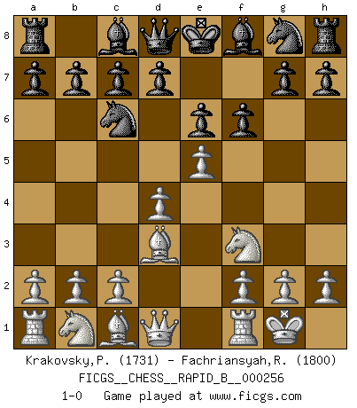 Last move : 1-0 2018 April 11 8:50:16 [Event "FICGS__CHESS__RAPID_B__000256"] [Site "FICGS"] [Date "2018.01.31"] [Round "1"] [White "Krakovsky,Peter"] [Black "Fachriansyah,Ryan"] [Result "1-0"] [WhiteElo "1731"] [BlackElo "1800"] 1.e4 Nf6 2.e5 Ng8 3.d4 e6 4.Nf3 f6 5.Bd3 Nc6 6.O-O 1-0 This chess game has been lost on time (started : 2018.01.31 15:43:16) Alekhine's defense : Brooklyn defense Kingside Castling by player White (move 6) Player White won this chess game. Follow this game move after move (download)Discovered check is the dive bomber of the Chessboard. (Reuben Fine) Ich bin der einzige Schachspieler, der sich während der Vorbereitungen zum Turnier verletzt hat. (Woody Allen) El Ajedrez es el juego mas altamente simbólico, pero las agresiones estan por lo tanto aún mas francamente representadas en la partida. Tal vez comenzo como un juego de guerra; Algo como la representación de una batalla en miniatura entre las fuerzas de dos reinos. (Karl Meninger) Vous savez, camarade Pachman, je n'éprouve pas de plaisir à être ministre, je jouerais plutôt aux échecs comme vous, ou alors ferais une révolution au Venezuela. (Che Guevara à Ludek Pachman, 'Checkmate in Prague', 1975) I find your interest interesting. (Gregory House, House M.D.)