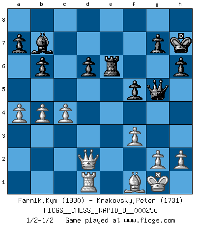 Last move : 1/2-1/2 2018 March 27 10:4:16 [Event "FICGS__CHESS__RAPID_B__000256"] [Site "FICGS"] [Date "2018.01.04"] [Round "1"] [White "Farnik,Kym"] [Black "Krakovsky,Peter"] [Result "1/2-1/2"] [WhiteElo "1830"] [BlackElo "1731"] 1.d4 Nf6 2.c4 e6 3.Nf3 b6 4.a3 Bb7 5.Bf4 Be7 6.e3 Nh5 7.Bg3 O-O 8.Be2 c5 9.Nc3 cxd4 10.exd4 f5 11.d5 Na6 12.O-O Nc5 13.Be5 d6 14.Bd4 Nf4 15.dxe6 Qe8 16.Nd5 Ncxe6 17.Re1 Qf7 18.Nxe7+ Qxe7 19.Bf1 Qf7 20.Bc3 Rad8 21.Re3 Nc5 22.b4 Ne4 23.Nd4 Qg6 24.Qf3 Qh6 25.Rae1 Rd7 26.Qd1 Qg6 27.Qc2 Re7 28.Rf3 Ne6 29.Rd3 Nf4 30.Rf3 Ne6 31.Nxe6 Rxe6 32.Rd3 Rfe8 33.f3 Nxc3 34.Rxe6 Rxe6 35.Qxc3 h6 36.a4 Qg5 37.Kf2 Qh4+ 38.Kg1 Qg5 39.Rd1 Kh7 40.Kf2 Qh4+ 41.Kg1 Qg5 42.Qd2 1/2-1/2 Queen's Indian : Petrosian system Kingside Castling by player Black (move 7) Kingside Castling by player White (move 12) This chess game ended in a draw. Follow this game move after move (download)I guess a certain amount of temperament is expected of Chess geniuses. (Ron Gross) Es ist im Leben wie im Schachspiel. Wir entwerfen einen Plan, dieser bleibt jedoch bedingt durch das, was im Schachspiel dem Gegner, im Leben dem Schicksal zu tun belieben wird. (Arthur Schopenhauer) Un sacrificio se refuta mucho mejor al aceptarlo. (Wilhelm Steinitz) Je menace de comprendre la position. (Anonyme) Kids, you tried your best and you failed miserably. The lesson is, never try. (Simpsons)