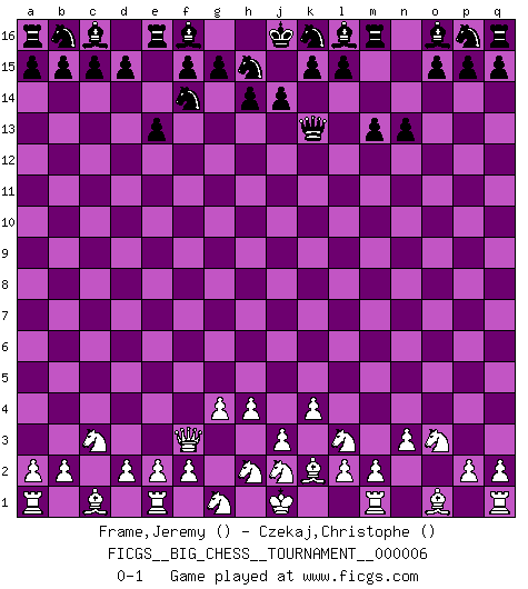 Last move : 0-1 2007 May 17 0:54:28 [Event "FICGS__BIG_CHESS__TOURNAMENT__000006"] [Site "FICGS"] [Date "2007.04.20"] [Round "1"] [White "Frame,Jeremy"] [Black "Czekaj,Christophe"] [Result "0-1"] [WhiteElo ""] [BlackElo ""] 1.k2-k4 j15-k13 2.g2-g4 h16-o10 3.h3-h4 o10-o2 4.p1-o3 o2-c13 5.h1-f3 g16-f14 6.f1-o9 c13-c2 7.b1-c3 c2-o13 8.o9-k13 o13-k13 9.n2-n3 n15-n13 10.k1-l3 m15-m13 11.l1-k2 e15-e13 0-1 Follow this game move after move (download)Alekhine is a poet who creates a work of art out of something that would hardly inspire another man to send home a picture post card. (Max Euwe) Um dein Spiel zu verbessern musst du zuallererst das Endspiel studieren, denn diese kann unabhängig studiert werden. Die Eröffnung und das Mittelspiel müssen immer in Bezug gesetzt werden zum Endspiel. (José Raúl Capablanca) Ciertamente el estado mental actual de Bobby Fischer es una tragedia. Uno de los mas grandes jugadores de Ajedrez del mundo -el orgullo y pena del Ajedrez Americano. (Frank Brady) Les pièces de l'échiquier étaient impitoyables. Elles le retenaient, elles l'absorbaient. Il y avait de l'horreur en cela, mais aussi une harmonie unique. Car, qu'y a-t-il dans le monde, à part les échecs ? (V. Nabokov) Faith : not wanting to know what is true. (Friedrich Nietzsche)