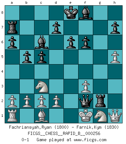 Last move : 0-1 2018 February 16 20:28:40 [Event "FICGS__CHESS__RAPID_B__000256"] [Site "FICGS"] [Date "2018.01.31"] [Round "1"] [White "Fachriansyah,Ryan"] [Black "Farnik,Kym"] [Result "0-1"] [WhiteElo "1800"] [BlackElo "1830"] 1.e4 c5 2.Qf3 Nc6 3.Bc4 Nf6 4.Nc3 e6 5.Qf4 a6 6.e5 Nh5 7.Qf3 g6 8.g4 Nxe5 9.Qe4 Nxc4 10.Qxc4 b5 11.Qe4 Ra7 12.gxh5 Bb7 13.Qe5 f6 14.Qg3 Bxh1 15.hxg6 Rg8 16.h4 Rxg6 17.Qh2 Bc6 18.h5 Rg2 19.Qh1 Qc7 20.f3 Qg3+ 21.Kf1 Qf2+ 0-1 Sicilian defense Player Black won this chess game. Follow this game move after move (download)The most powerful weapon in Chess is to have the next move. (David Bronstein) Karpov ist ein Museumsstück. (Garry Kasparov) El Ajedrez te enseña a controlarl la excitación inicial que sientes cuando vez algo que parece bueno y te enseña a pensar objetivamente cuando te encuentras en problemas. (Stanley Kubrick) Echiquier : carré parfait, comme la Jérusalem nouvelle décrite par l'auteur de l'Apocalypse, huit cases sur huit, exaltation du chiffre 4, symbole du cosmos aux quatre horizons... où le noir et le blanc, l'ombre et la lumière, le mal et le bien s'entremêlent et se conjuguent. (Robert Couffignal, Le Gambit du poète) Success without honor is an unseasoned dish; it will satisfy your hunger, but it won't taste good. (Joe Paterno)