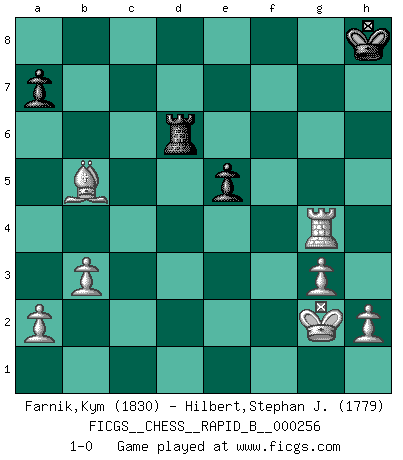 Last move : 1-0 2018 April 6 1:27:52 [Event "FICGS__CHESS__RAPID_B__000256"] [Site "FICGS"] [Date "2018.01.04"] [Round "1"] [White "Farnik,Kym"] [Black "Hilbert,Stephan J."] [Result "1-0"] [WhiteElo "1830"] [BlackElo "1779"] 1.d4 Nf6 2.c4 e6 3.Nf3 b6 4.g3 Bb7 5.Bg2 Be7 6.O-O O-O 7.Re1 Na6 8.Bf4 c5 9.Nc3 cxd4 10.Qxd4 d6 11.Qd2 Qc8 12.e4 e5 13.Bg5 Qxc4 14.Nh4 g6 15.Bh6 Rfd8 16.Nf5 Qe6 17.Nxe7+ Qxe7 18.Bg5 Rac8 19.Nd5 Bxd5 20.exd5 Nc7 21.f4 Nce8 22.Re2 h6 23.Bxh6 Nd7 24.f5 gxf5 25.Bh3 Ng7 26.Rf1 f6 27.Rxf5 Nxf5 28.Bxf5 b5 29.Qd1 Nf8 30.Re1 Rc7 31.Qg4+ Kh8 32.Qh4 Kg8 33.b3 Nh7 34.Re4 Kh8 35.Bxh7 f5 36.Bxf5 Qxh4 37.Rxh4 Re8 38.Bf8 Kg8 39.Bxd6 Rc1+ 40.Kg2 Rd1 41.Rg4+ Kh8 42.Bd7 Rxd5 43.Bxe8 Rxd6 44.Bxb5 1-0 Queen's Indian : Old Main line, 6.O-O Kingside Castling by player White (move 6) Kingside Castling by player Black (move 6) Player White won this chess game. Follow this game move after move (download)Different people feel differently about resigning. (Bobby Fischer) Um sich vor der Gefahr einer Erkältung zu schützen, sorge der wanderlustige König beizeiten für ein brauchbares Versteck. (Aaron Nimzowitsch) Del Ajedrez se ha dicho que la vida no es lo suficientemente larga para él, pero eso es culpa de la vida, no del Ajedrez. (William Ewart Napier) L'ordinateur a tué l'originalité. Il n'y a plus guère d'aventures sur l'échiquier. (Jacob Murray) The ultimate in disposing one's troops is to be without ascertainable shape. Then the most penetrating spies cannot pry in nor can the wise lay plans against you. (Sun Tzu)