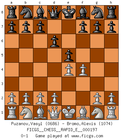 Last move : 0-1 2018 February 9 1:46:49 [Event "FICGS__CHESS__RAPID_E__000197"] [Site "FICGS"] [Date "2018.01.05"] [Round "1"] [White "Puzanov,Vasyl"] [Black "Bromo,Alexis"] [Result "0-1"] [WhiteElo "0686"] [BlackElo "1074"] 1.e4 e5 2.f4 d6 0-1 This chess game has been lost on time (started : 2018.01.05 4:5:34) King's gambit Player Black won this chess game. Follow this game move after move (download)Chess is a cold bath for the mind. (Sir John Simon) Kleine Schachspieler machen Mist, und große Schachspieler machen Mist, aber große machen weniger Mist. (Fritz Sämisch) Cuando veas una buena jugada, trata de encontrar otra mejor. (Emanuel Lasker) Dans le domaine de la peinture, de la gravure et de la sculpture, dès la première décennie de notre siècle, les artistes abandonnent la représentation de la partie d'échecs pour se concentrer sur les pièces, sur les échiquiers et sur toutes les variations auxquelles les unes et les autres peuvent donner lieu. On passe en quelque sorte d'un thème social à un thème musical (au sens de la musica médiévale, c'est-à-dire d'une notion qui inclue le rythme, l'harmonie, la construction et la déconstruction, etc.). Graphiquement et picturalement, l'échiquier apparaît comme une structure ouverte, dynamique, d'une richesse infinie, autorisant toutes les combinatoires et débouchant sur des mouvements et des rythmes de nature exponentielle. (Michel Pastoureau) If I had no sense of humor, I would long ago have committed suicide. (Mahatma Gandhi)